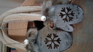 Schattige decoratie houten winter handschoentjes op gemaakt met bont en touw om op te hangen. .